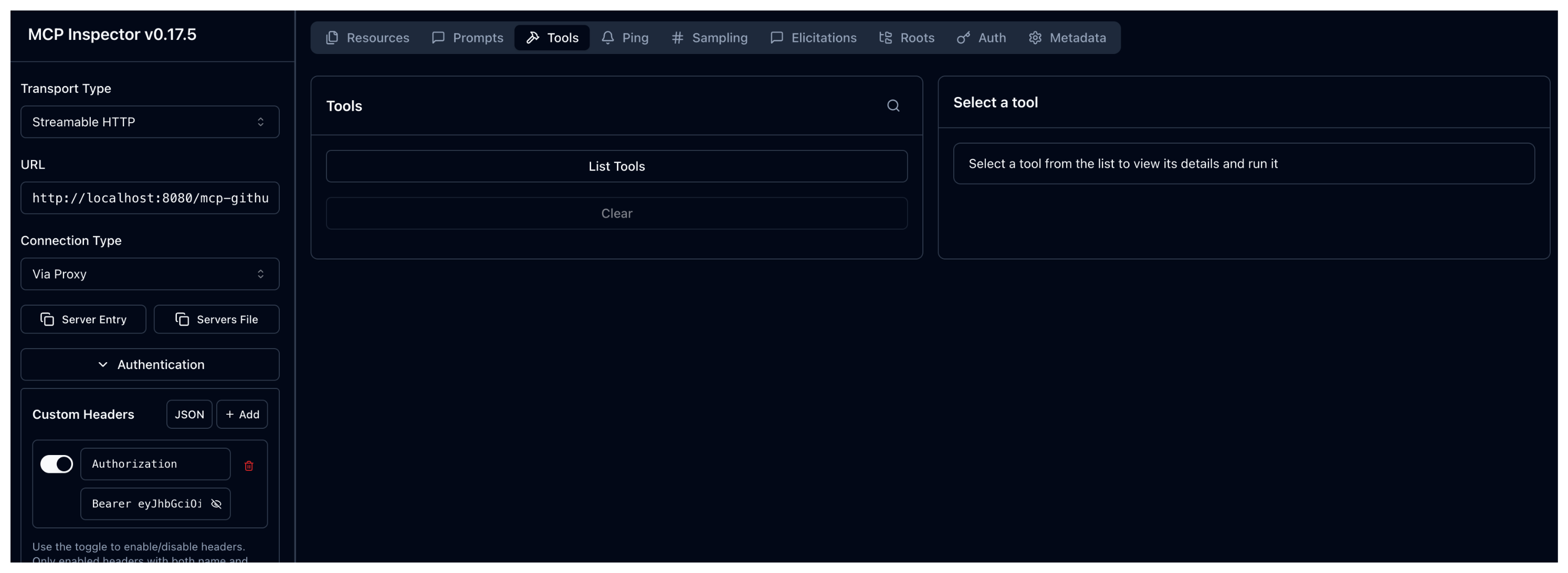 2. Go back to the MCP inspector tool. In the Authentication > Custom Headers card enter the JWT token for Bob. Then, click Re-connect.