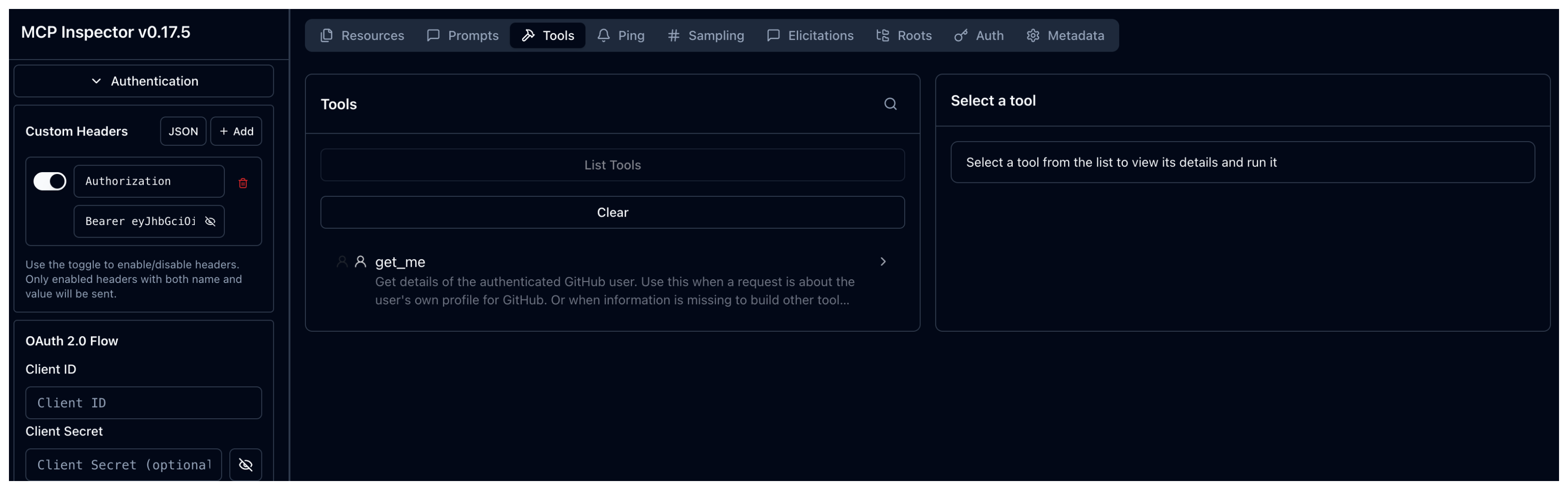 Verify that the connection succeeds and that you can successfully access the get_me tool.